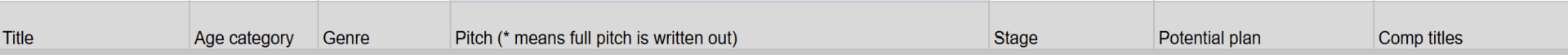 In case that’s hard to see, the categories are title, age category, genre, pitch, stage, potential plan, and comp titles.